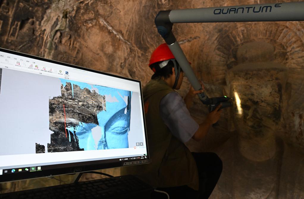 2025年4月9日環迅評測網,武漢大學文化遺產智能計算實驗室團隊成員在魏字洞使用關節臂掃描儀對佛像進行數字化掃描。新華社記者 李嘉南 攝